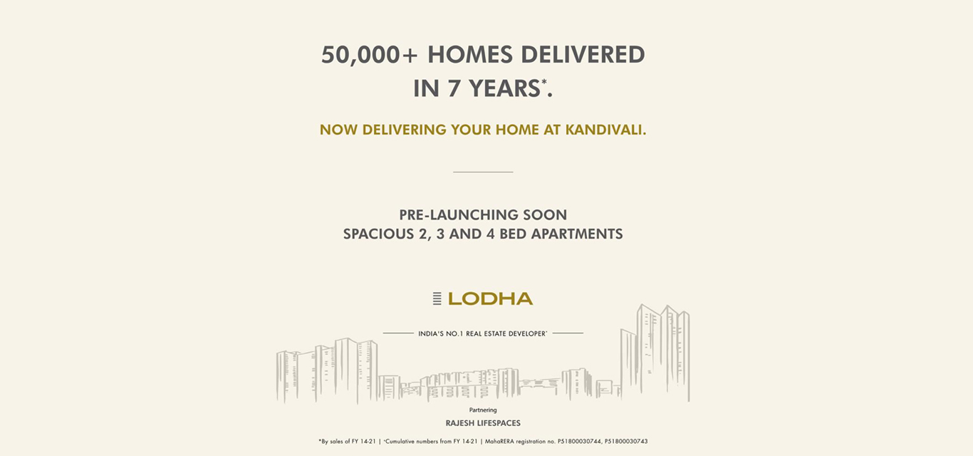 Lodha New Launch Kandivali is a New Residential Apartments Pre Launch Projects by Lodha Group in Kandivali, Mumbai. Check Lodha New Launch Kandivali Project Details about 2,3 BHK Property like Price List, Floor Plan, Area, Location Map, Construction Status, Possession, Brochure, Photos and Reviews.