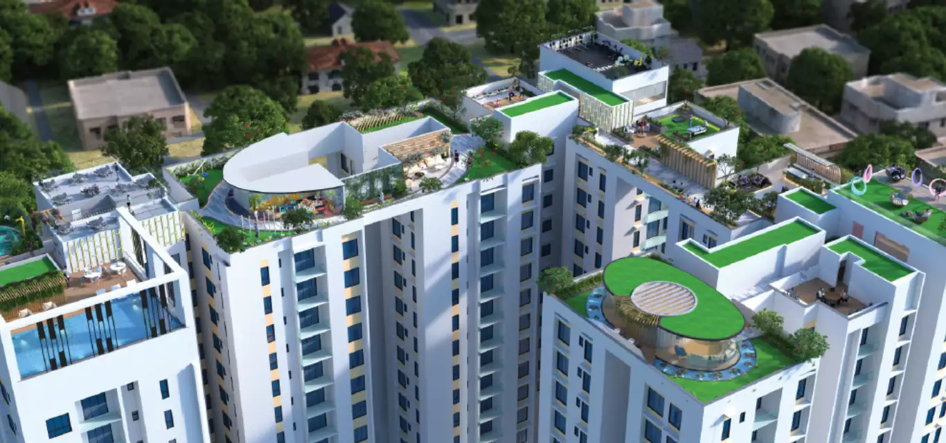 72000 sq.ft sprawling area 10% Infinite sky 25000 sq.ft sky club Abundant lush green IGBC Certified green building Land Area - 102 Cottahs Floor per tower - G+12 No. of towers - 3 Infinity pool Kid's pool Indoor games room Multipurpose court Indoor lounge Yoga deck Banquet hall Indoor Gymnasium
