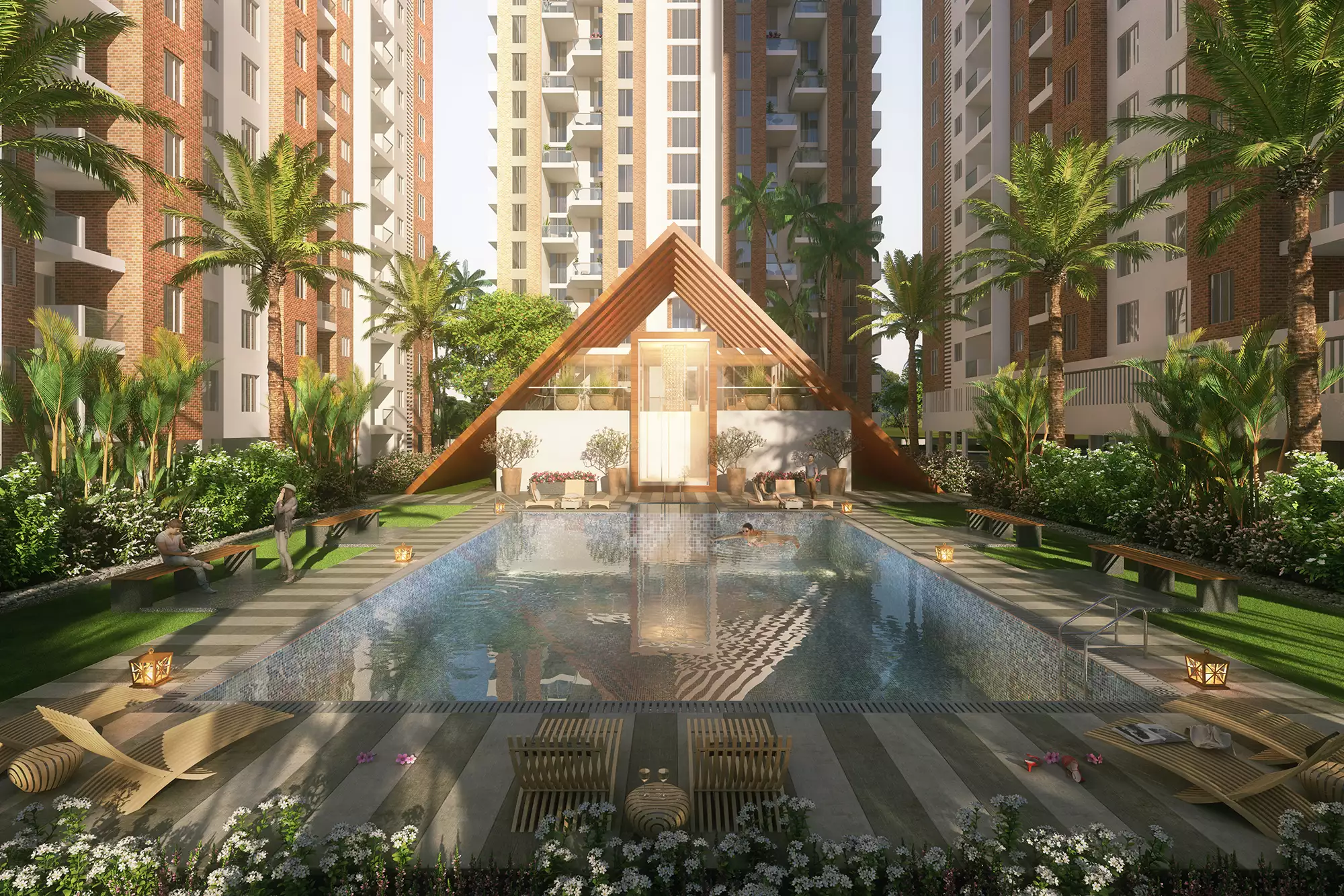 Open space with tropical forest, senior citizen plaza and temple
